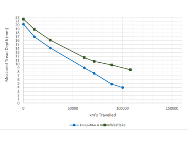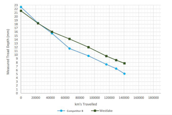 Tread depth: Westlake AD713 21.5mm and competitor B 22.5mm. The Westlake AD713 tyres managed to achieve 10263km/mm of tread depth and the Chinese tyre brand B managed to achieve 8079km/mm of tread depth at the time of the last survey on 25 March 2017. Since the last survey, the B tyres have been removed because they reached the minimum permissible tread depth and the Westlake tyres still had permissible tread depth remaining. According to the odometer reading, brand B’s total possible number of kilometres was calculated as 149 461km and Westlake’s total possible kilometres is calculated as 179 603km.